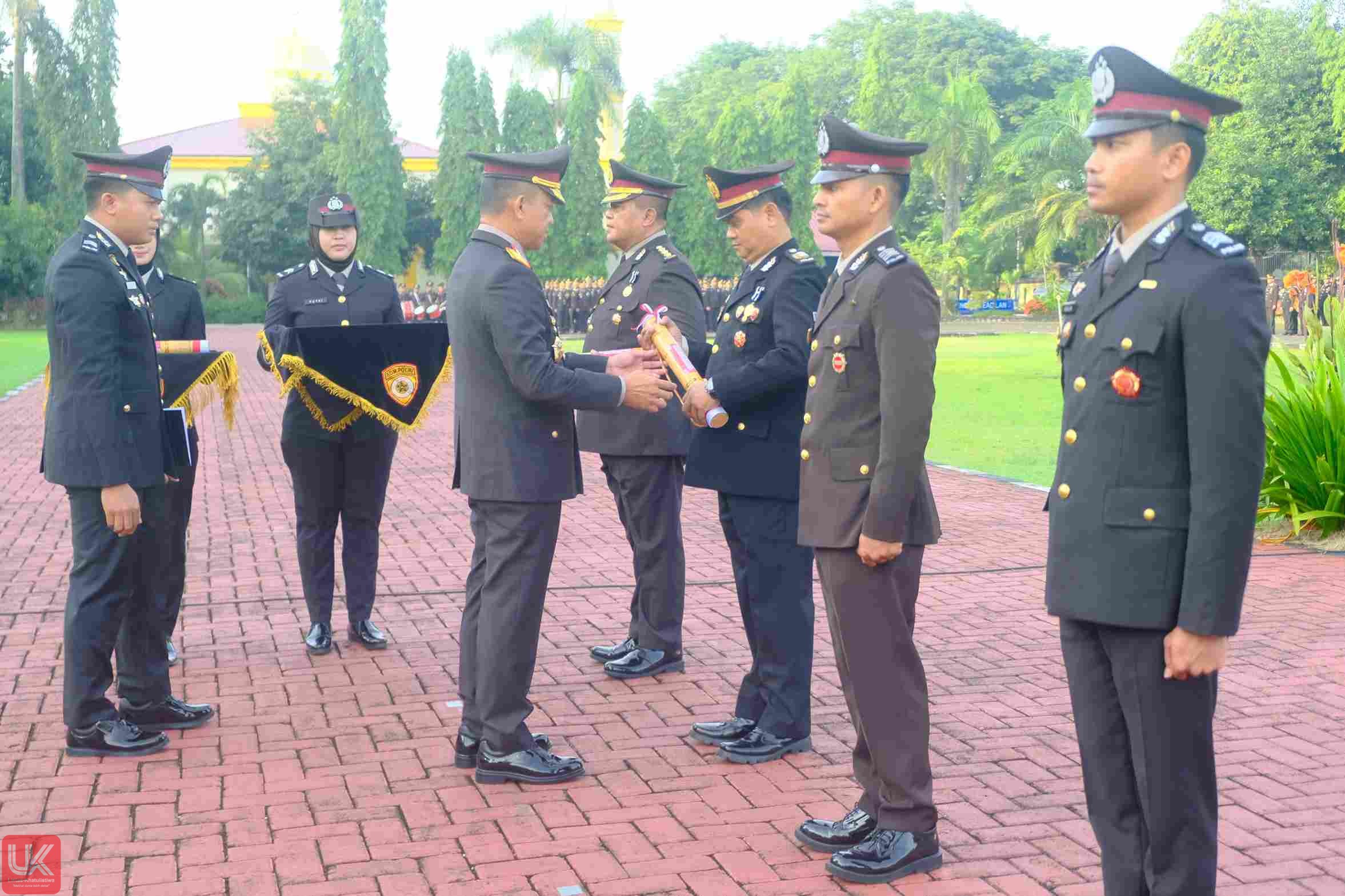 Upacara berlangsung dengan khidmat dan tertib, diikuti oleh para pejabat utama Polda Sulsel, perwira, serta personel penerima tanda kehormatan Satya Lencana Pengabdian.