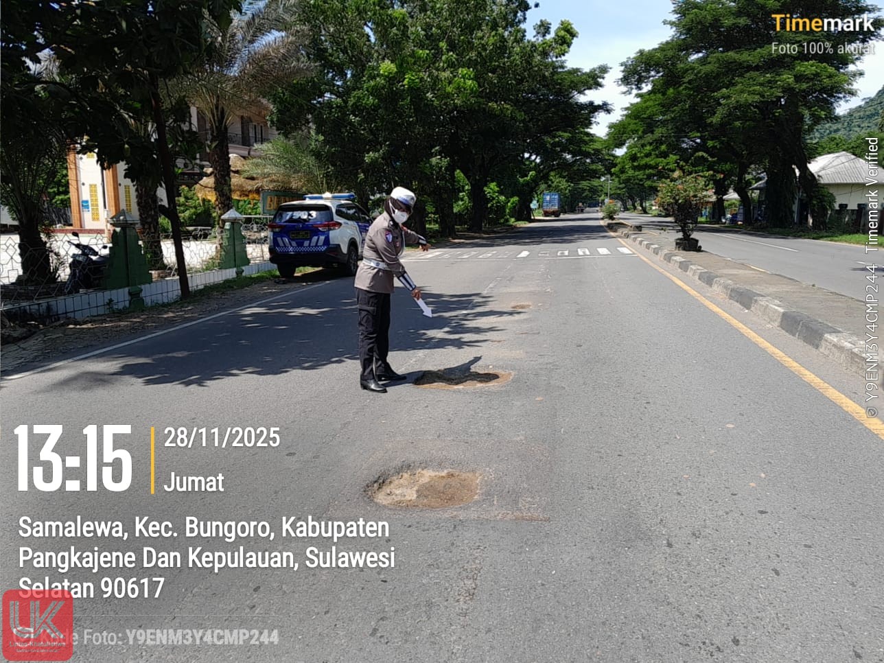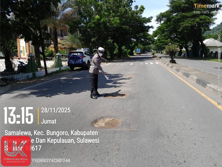 Pangkep — Pada Jumat, 28 November 2025 sekitar pukul 13.30 Wita, Satgas Preemtif Operasi Zebra Pallawa 2025 Polres Pangkep kembali melaksanakan kegiatan pencegahan kecelakaan lalu lintas melalui pengecekan kondisi jalan di sepanjang Jalan Poros Trans Sulawesi, wilayah Kabupaten Pangkep.