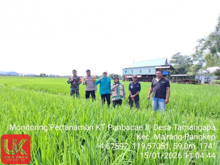Lintas-Khatulistiwa.com. | Ma’rang — Wujud nyata kepedulian terhadap ketahanan pangan dan kesejahteraan petani terus ditunjukkan oleh unsur TNI-Polri di wilayah Kecamatan Ma’rang. Bhabinkamtibmas Desa Tamangapa, Polsek Ma’rang, Briptu H. Rachman bersama Babinsa Koramil 1421-05 Ma’rang melakukan pendampingan kepada Petugas Penyuluh Lapangan (PPL) dan Petugas Pengendali Organisme Pengganggu Tumbuhan (POPT) Desa Tamangapa dalam kegiatan monitoring tanaman padi, Kamis (14/01/2026).