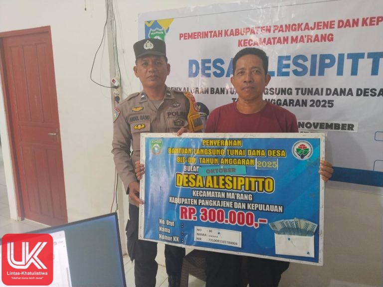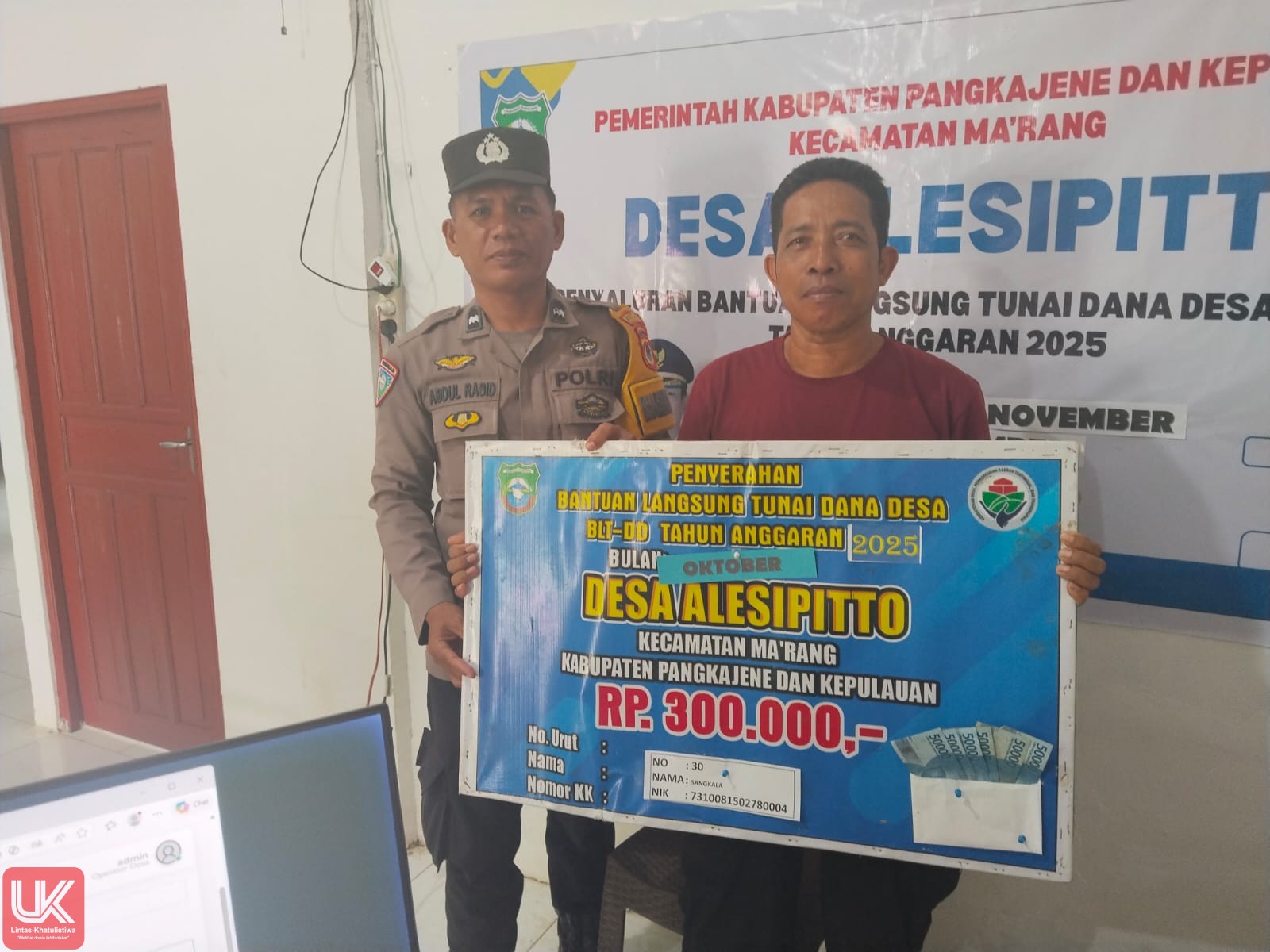 LINTAS-KHATULIATIWA.COM. Ma’rang – Pada Jumat pagi, 05 Desember 2025, Bhabinkamtibmas Polsek Ma’rang AIPDA H. Abdul Rasyid menghadiri kegiatan Penyerahan Bantuan Langsung Tunai Dana Desa (BLT-DD) Tahun Anggaran 2025 untuk periode bulan Oktober, November, dan Desember. Kegiatan tersebut berlangsung di Balai Desa Alesipitto, Kecamatan Ma’rang, Kabupaten Pangkajene dan Kepulauan