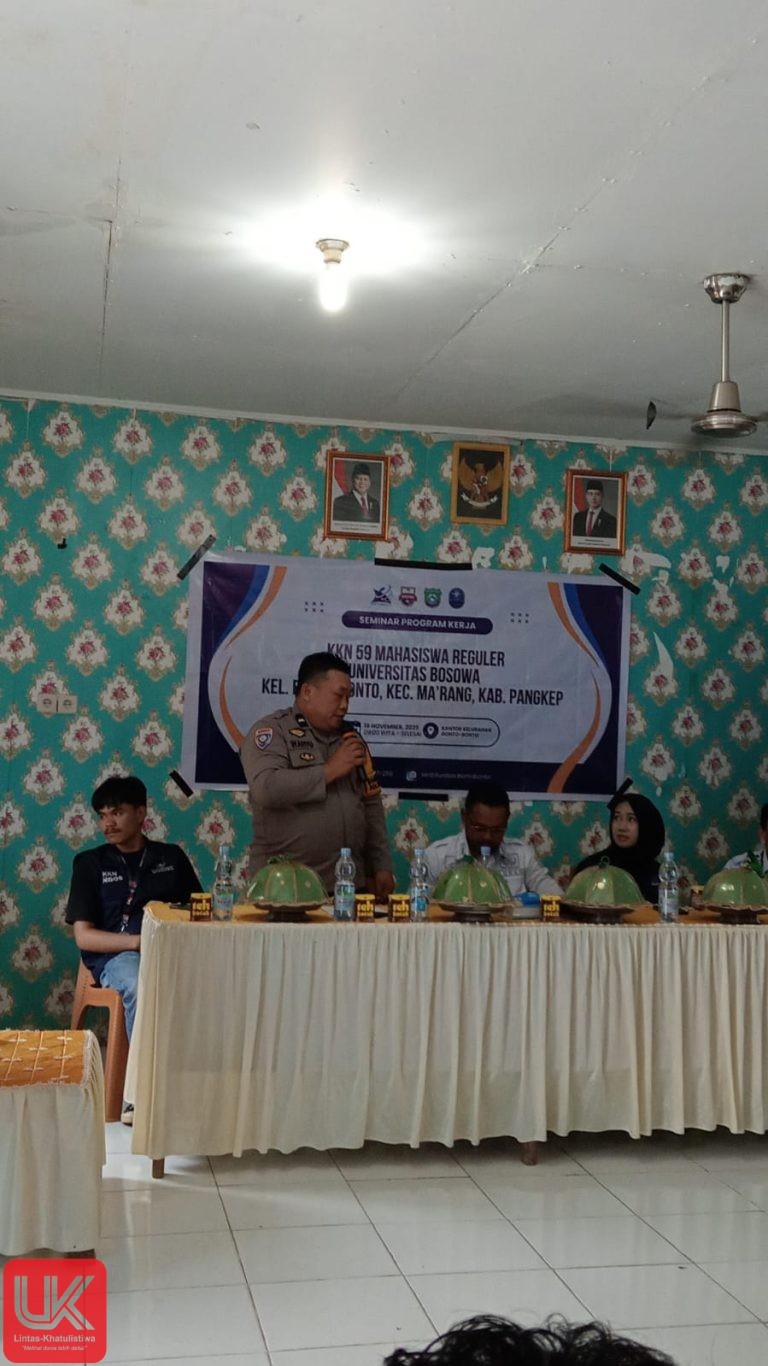 Ma’rang. Dalam rangka mendukung kelancaran pelaksanaan kegiatan akademik di wilayah Kelurahan binaannya, Bhabinkamtibmas Kel.Bonto-Bonto Aipda Wahyuddin menghadiri kegiatan seminar program Kuliah Kerja Nyata (KKN) yang dilaksanakan oleh mahasiswa Universitas Bosowa(UNIBOS) Rabu (19/11/2025).Pagi