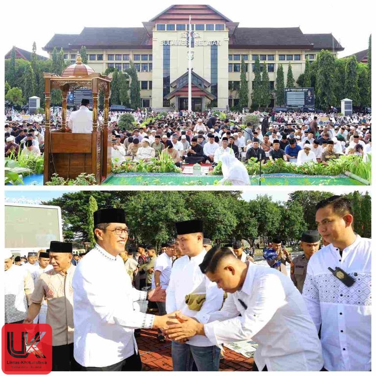 Lintas-Khatulistiwa.com | Kapolda Sulawesi Selatan Irjen Pol. Djuhandhani Rahardjo Puro, S.H., M.H., bersama Ketua Ketua Bhayangkari Daerah Sulsel Ny. Upi Djuhandhani, Melaksanakan Sholat Idul Fitri 1 Syawal 1447 Hijriah bersama umat Muslim di Lapangan Upacara Mapolda Sulsel, Sabtu (21/03/2026).