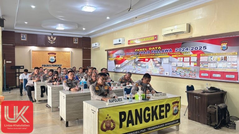 LINTAS-KHATULISTIWQ.COM. Pangkep – Kamis, 31 Juli 2025, pukul 15.00 WITA, bertempat di Ruang Vicon Mapolres Pangkep, Kapolres Pangkep AKBP M. Husni Ramli, S.I.K., M.H., M.Tr.Opsla mengikuti kegiatan Video Conference (Vicon) dalam rangka Analisa dan Evaluasi (Anev) Situasi Keamanan dan Ketertiban Masyarakat (Sitkamtibmas) terkini yang dipimpin langsung oleh Kepala Kepolisian Republik Indonesia (Kapolri) Jenderal Polisi Listyo Sigit Prabowo dan didampingi Pejabat Utama (PJU) Mabes Polri.
