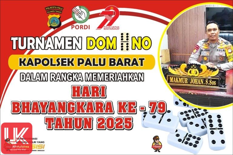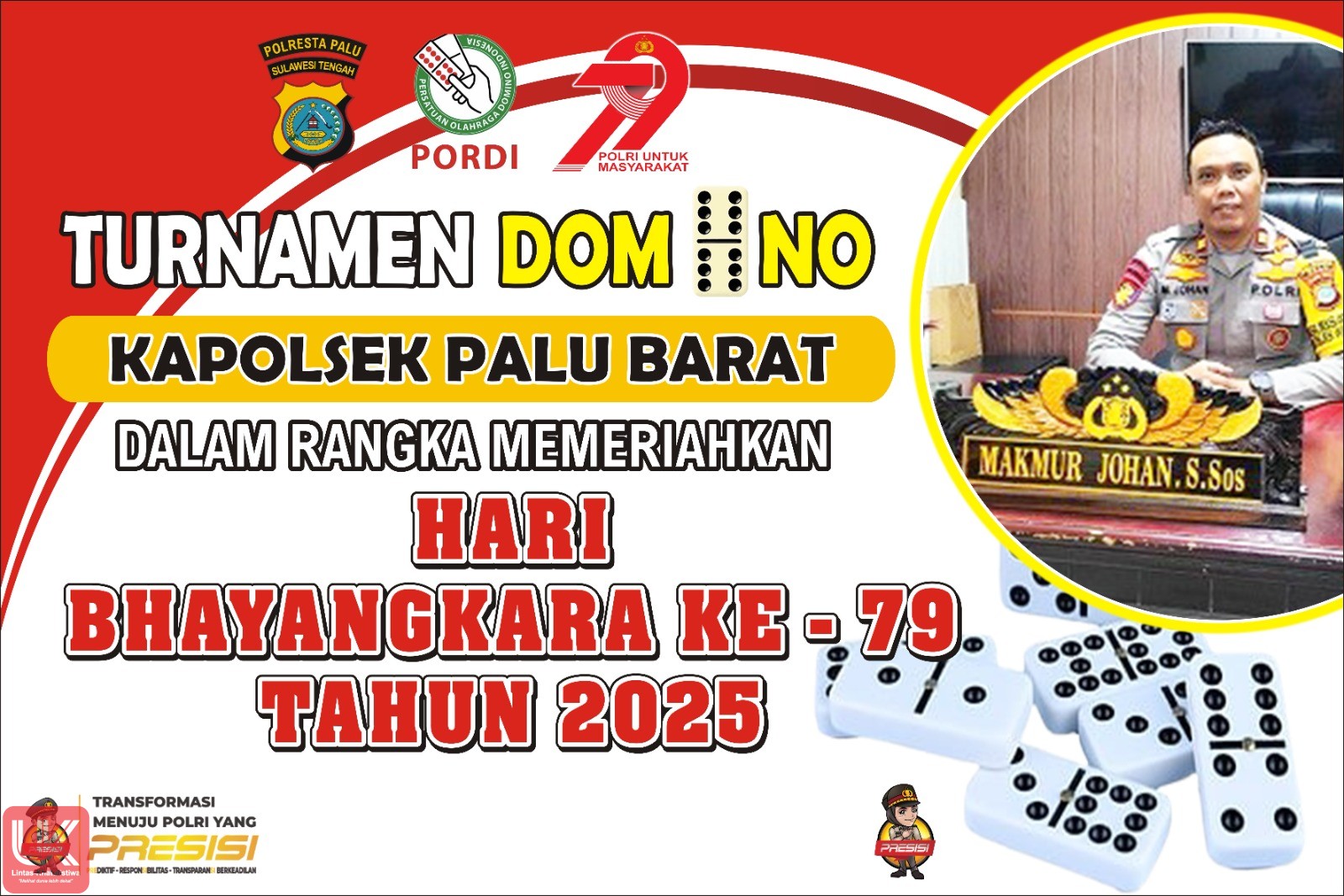 PALU – Menyambut Hari Bhayangkara ke-79, Kepolisian Sektor (Polsek) Palu Barat menggelar turnamen domino yang meriah, dimulai pada Senin malam, 16 Juni 2025. Acara dibuka secara resmi oleh Ka Polsek Palu Barat, Inspektur Polisi (Iptu) Makmur Jhohan, di Markas Polsek Palu Barat.