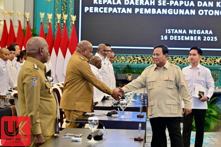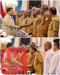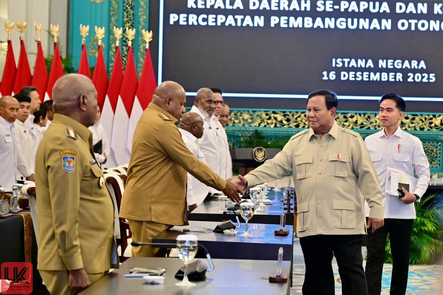 Lintas-Khatulistiwa.com. Jakarta– Presiden Prabowo Subianto memberikan pengarahan kepada Kepala Daerah se-Papua, hadir seluruh Gubernur dari 6 provinsi, 42 Bupati/Walikota, serta 10 anggota Komite Eksekutif Percepatan Pembangunan Otonomi Khusus Papua di Istana Negara, pada Selasa, 16 Desember 2025.