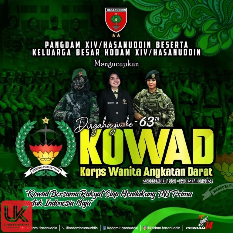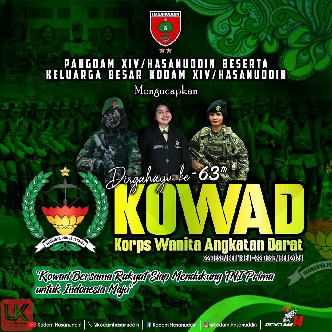 LINTAS-KHATULISTIWA.COM. MAKASSAR  – Pada tanggal 22 Desember setiap tahunnya, kita merayakan Hari Korps Wanita Angkatan Darat (KOWAD). Tahun ini, Pangdam XIV/Hsn bersama Keluarga Besar Kodam XIV/Hsn mengucapkan: “Dirgahayu Ke-63 Korps Wanita Angkatan Darat” dengan semangat “Kowad Bersama Rakyat Siap Mendukung TNI Prima untuk Indonesia Maju”. Momen peringatan ini bukan sekedar seremonial, namun merupakan pengakuan terhadap kontribusi perempuan dalam sejarah perjuangan bangsa Indonesia.