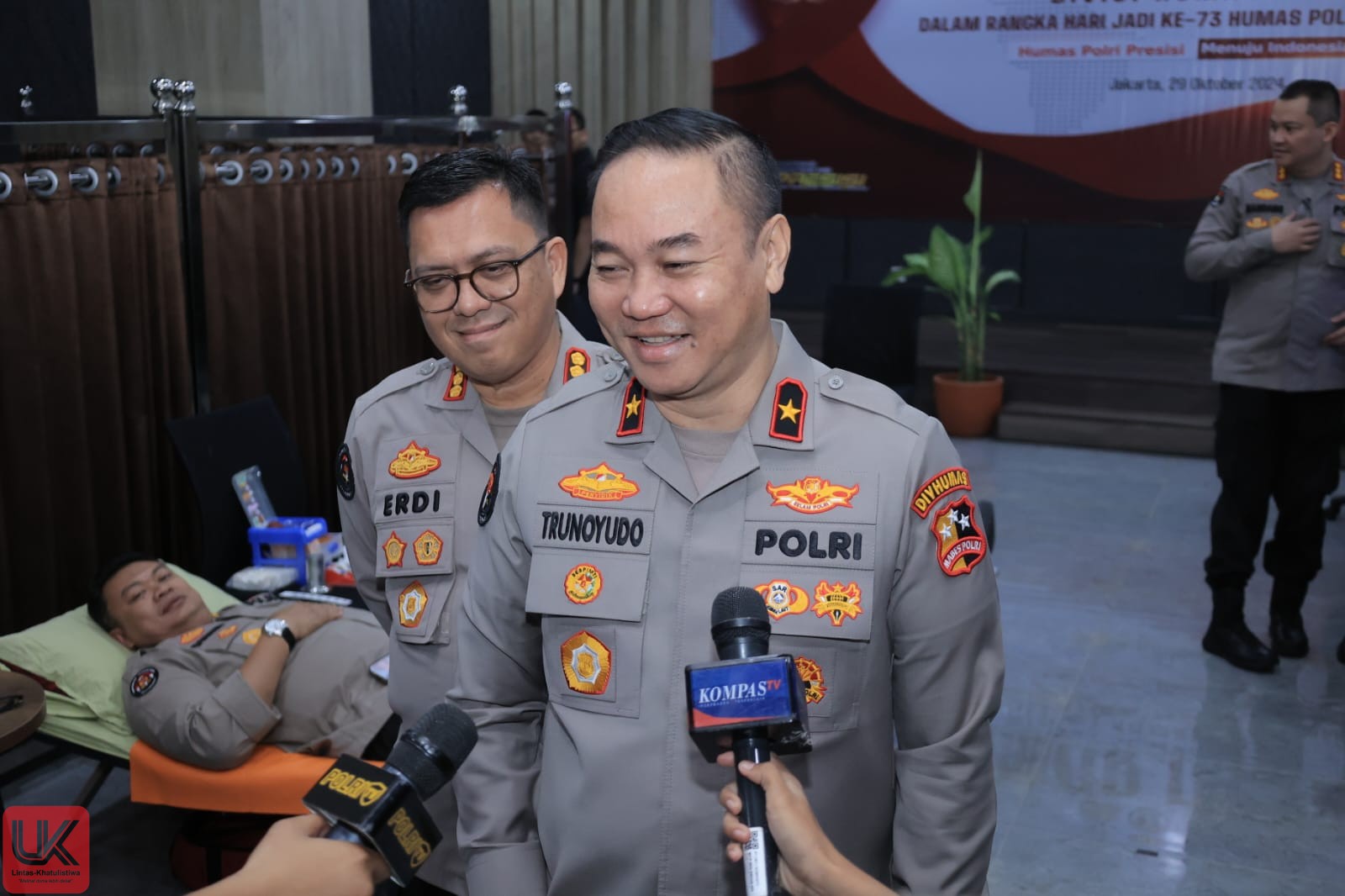 “Kepada Biro Penerangan Masyarakat (Karo Penmas) Brigjen. Pol. Trunoyudo Wisnu Andiko mengatakan, “sebelumnya telah dilaksanakan bakti sosial serta bakti keagamaan seperti santunan ke Pondok Pesantren, Jum’at Berkah dan Minggu kasih ke tempat-tempat ibadah serta panti asuhan sebanyak 73 tempat dengan berkolaborasi bersama rekan-rekan media, kemudian hari ini kami melakukan bakti kesehatan dengan melakukan donor darah bersama rekan-rekan media juga,” ujarnya.