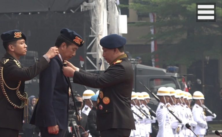 Lintas-khatulistiwa.com. Jakarta– Presiden Joko Widodo (Jokowi) mendapat penganugerahan Medali Kehormatan Loka Praja Samrakshana dari Polri. Jokowi juga diangkat menjadi warga kehormatan Brimob.